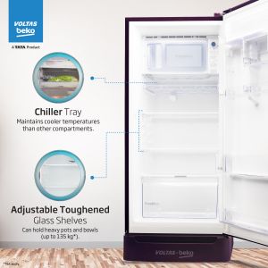 Our Direct Cool Single Door Fridge comes with smart & intuitive features like Active Fresh Blue LightTM for fruits & vegetables, a humidity-controlled Fresh BoxTM, adjustable shelves, Top BoxTM and much more!Voltas Beko Direct Cool Single Door refrigerator capacity
