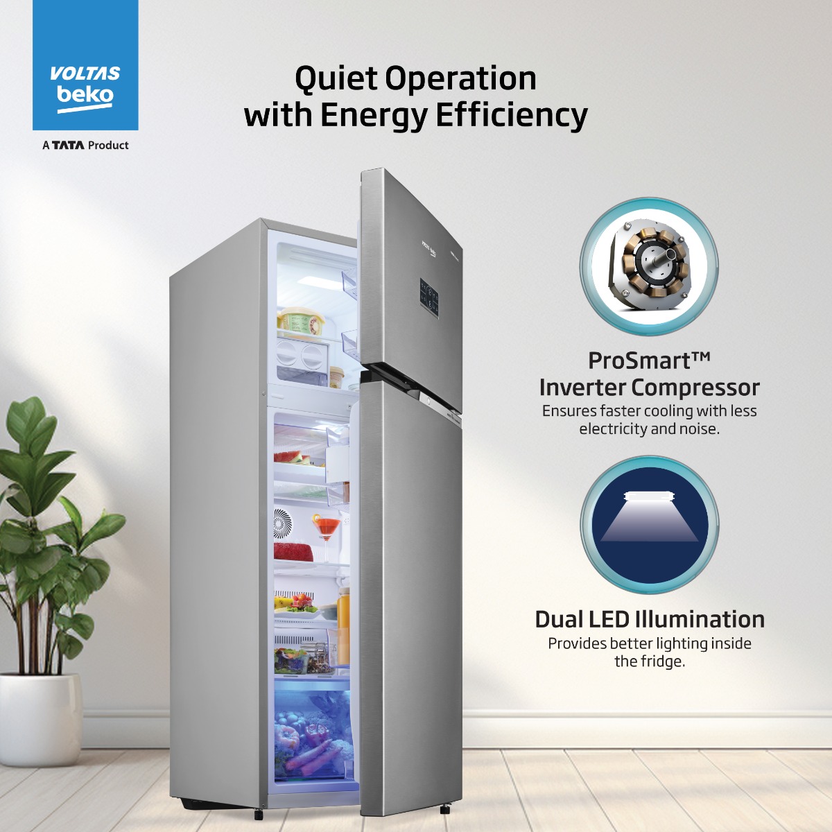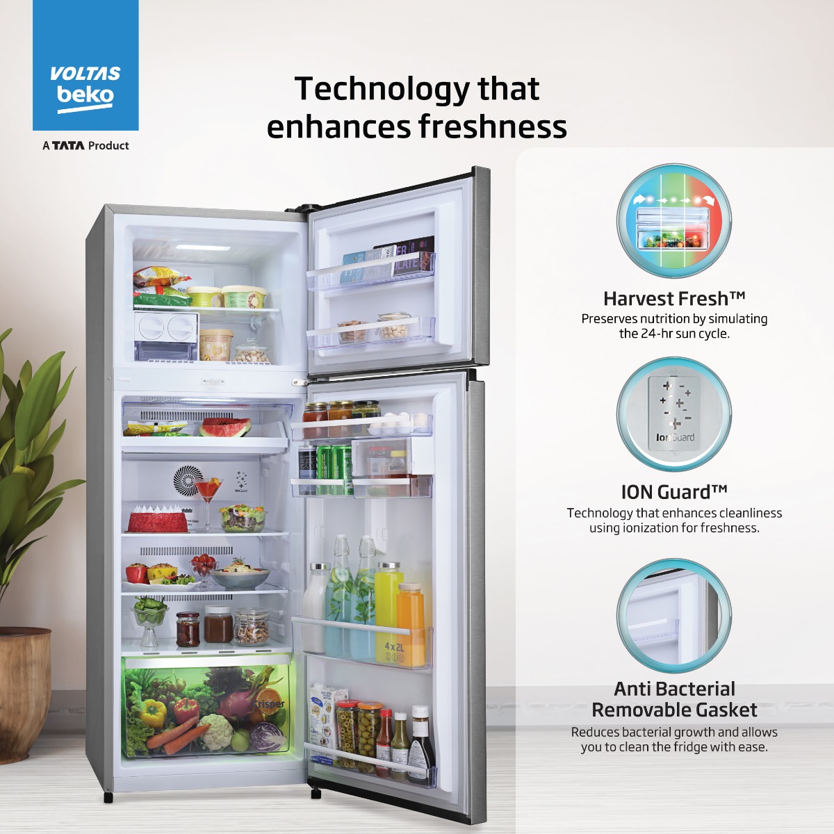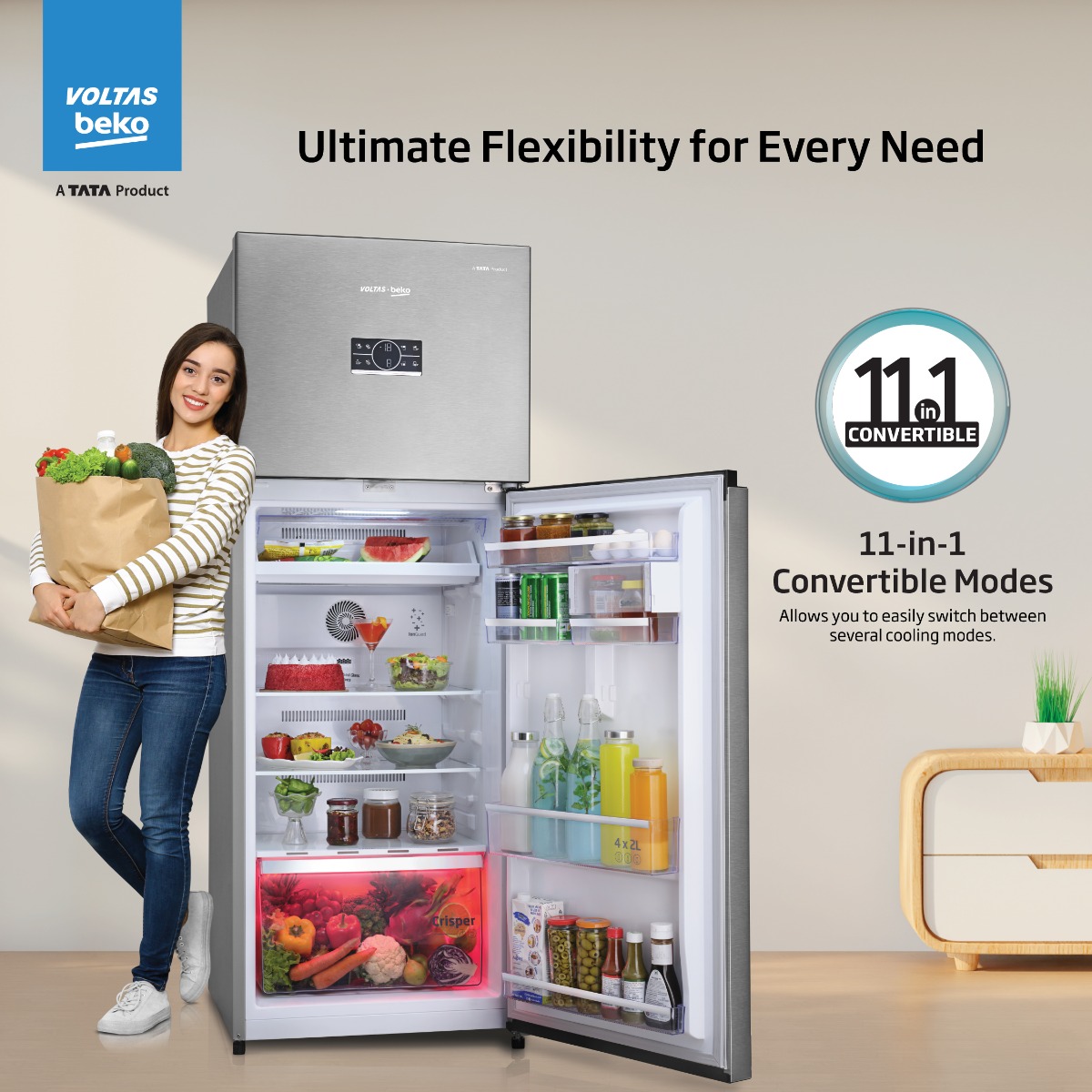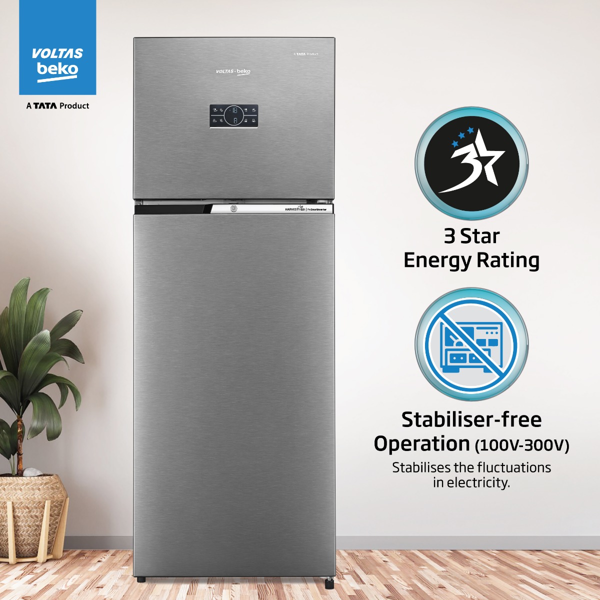 Voltas Beko 268 L, 3 Star, Frost Free Double Door Refrigerator with 11 in 1 Convertible and Harvest Fresh Technology (RFF315C/WPV501RXID, Brushed Silver)