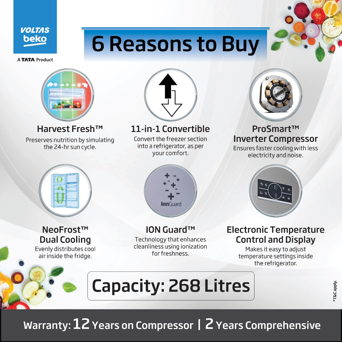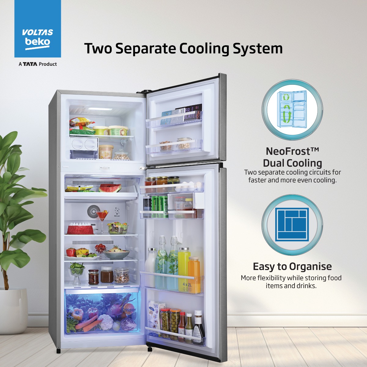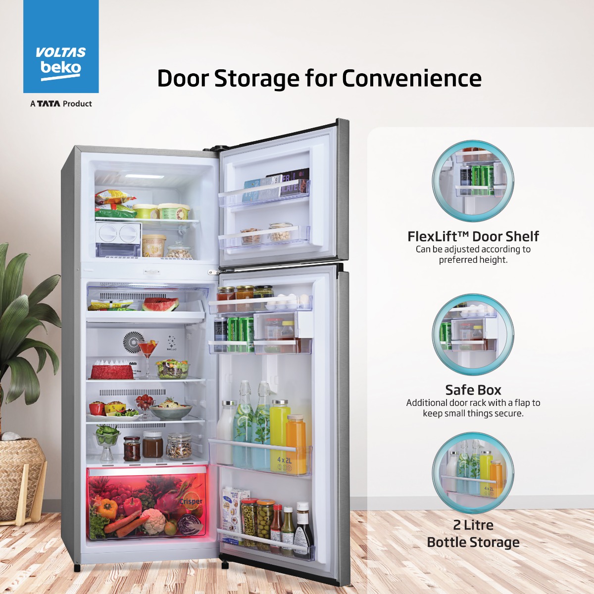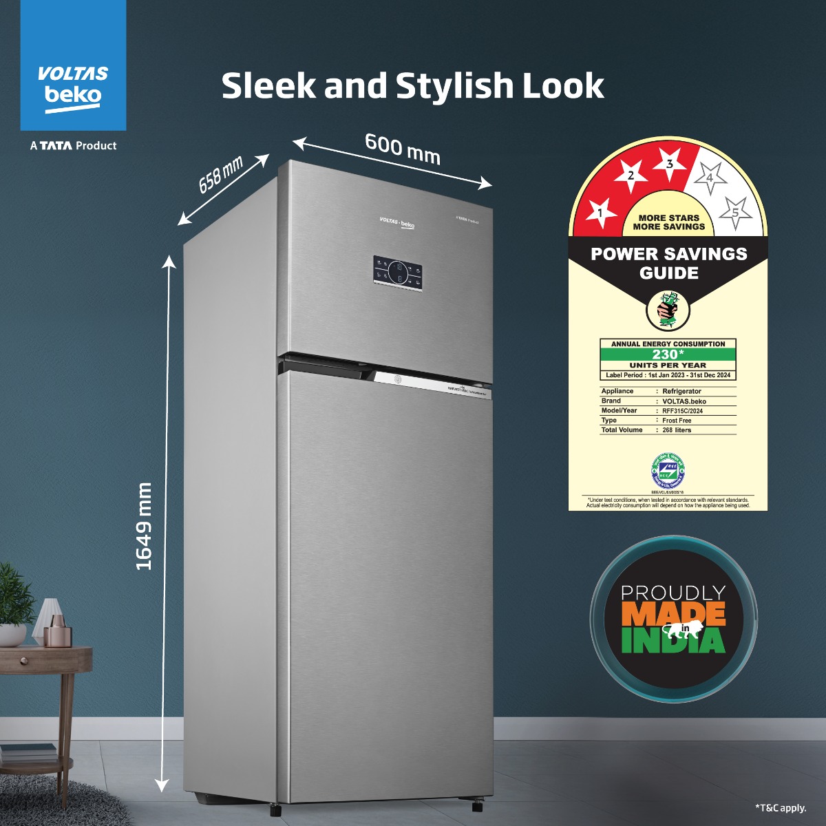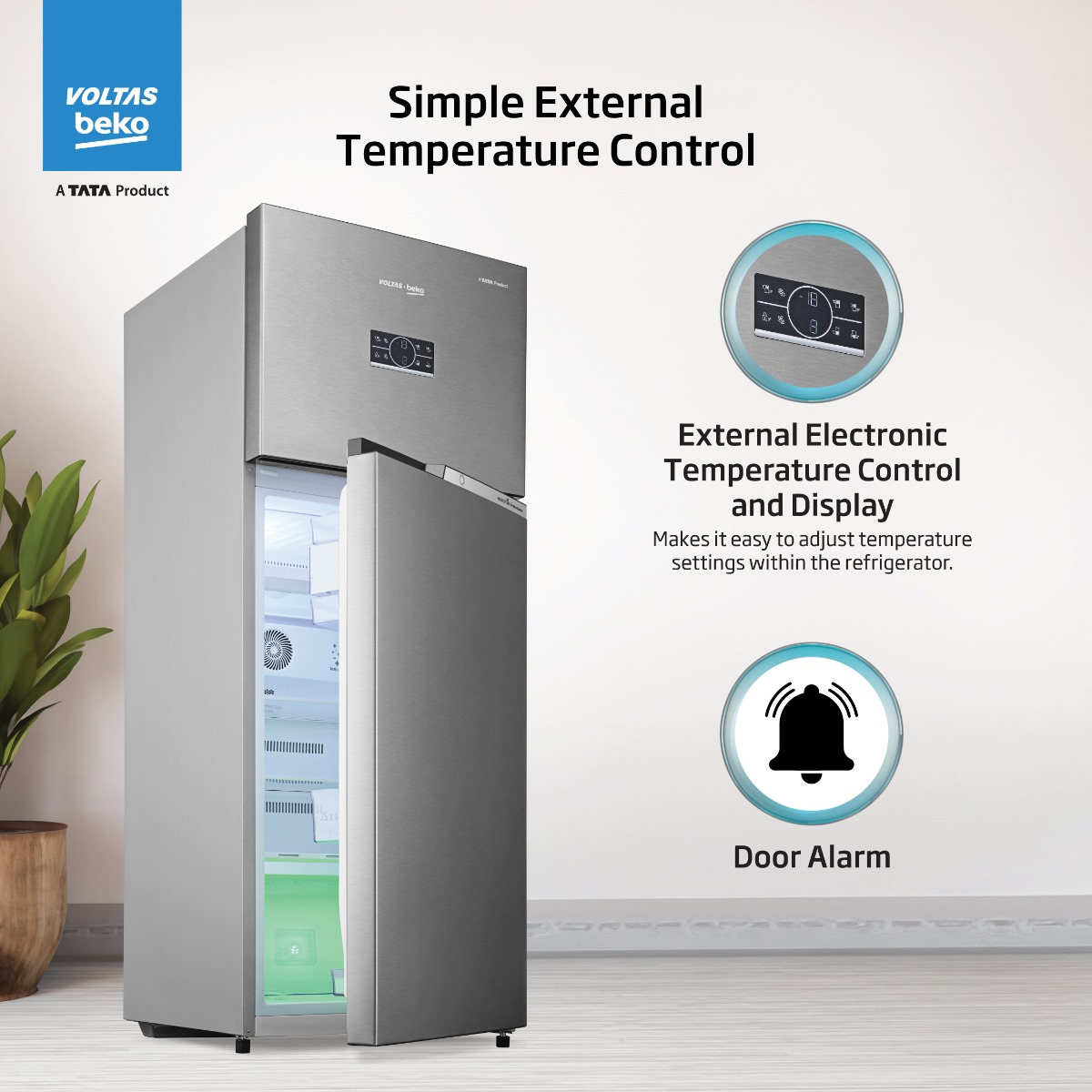 Voltas Beko 268 L, 3 Star, Frost Free Double Door Refrigerator with 11 in 1 Convertible and Harvest Fresh Technology (RFF315C/WPV501RXID, Brushed Silver)